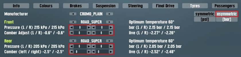 - Tyres > Front & Rear Pressure / Camber in asymmetric mode (note: symmetric mode works good)