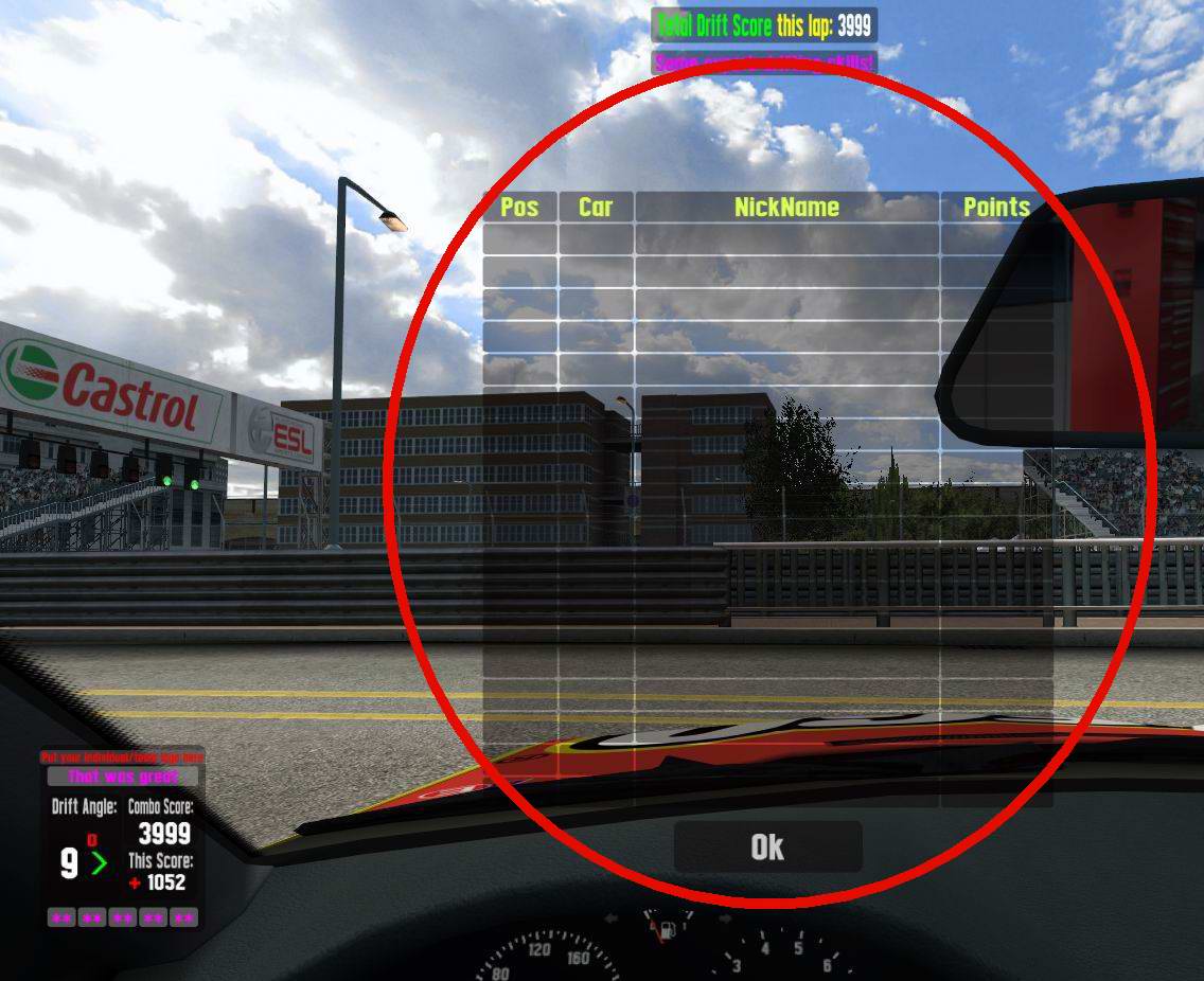Quote :The driftscore itself would be the same as before, I just want to adjust the total driftscore everytime a player passes the finishline in such that the total driftscore also depend on the laptime. That final adjusted score would then go into the DriftPB records.