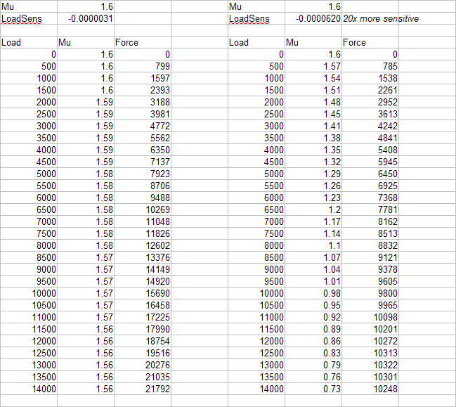Sorry, are you talking about the same numbers? Using the data you provided and the equation Juls provided I'd agree that the load sensitivity was severely understated in GTR2 (although 20x more would be too much).