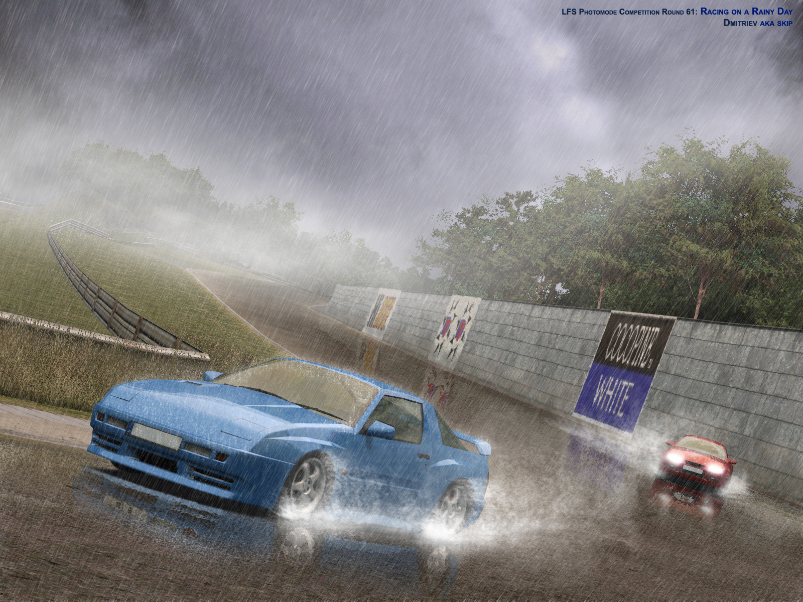 5. The rain in the picture goes only between the spectator and the car.