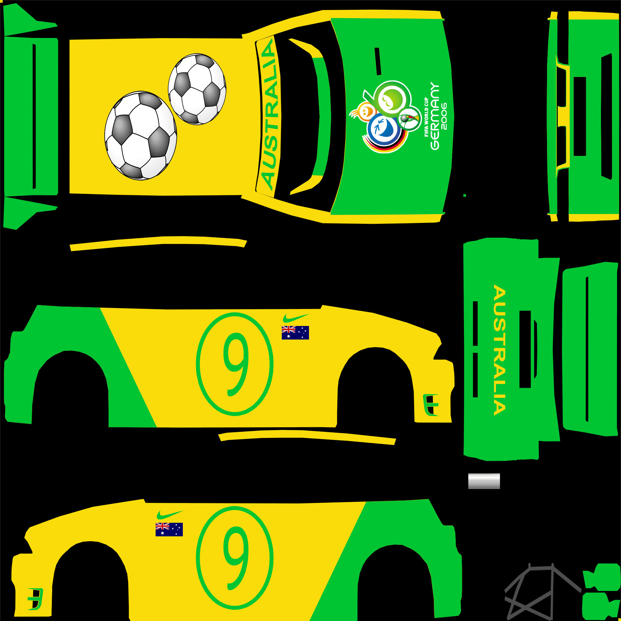 Well waiting in anticipation for Australia's first world cup match to start against Japan, I decided to knock up a quick skin for the XFR. This is in no means finished, I'm looking for suggestions