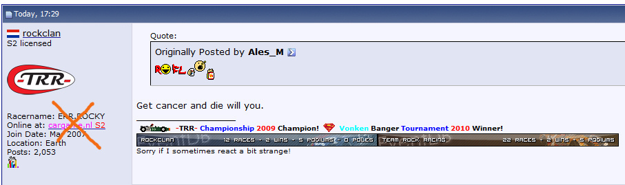 Quote from cargame.nl :Give me one reason why I still allow you to be on our servers with this ridiculous line of text.