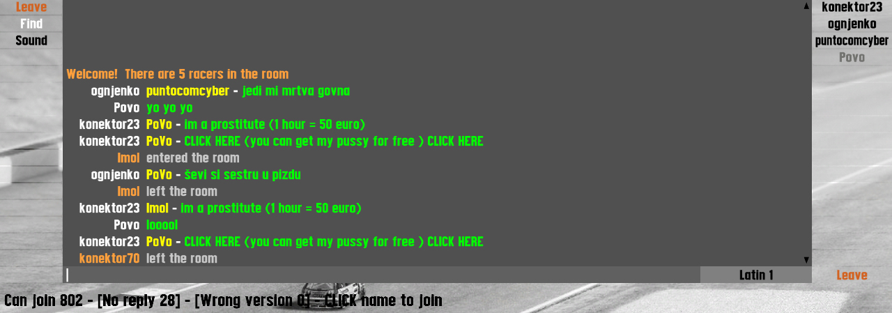 Quote from PoVo :Still, causing spam, using LFS's network.... If that's a start of it, wait till them bots will be able to join servers and spam. Then you won't say that.