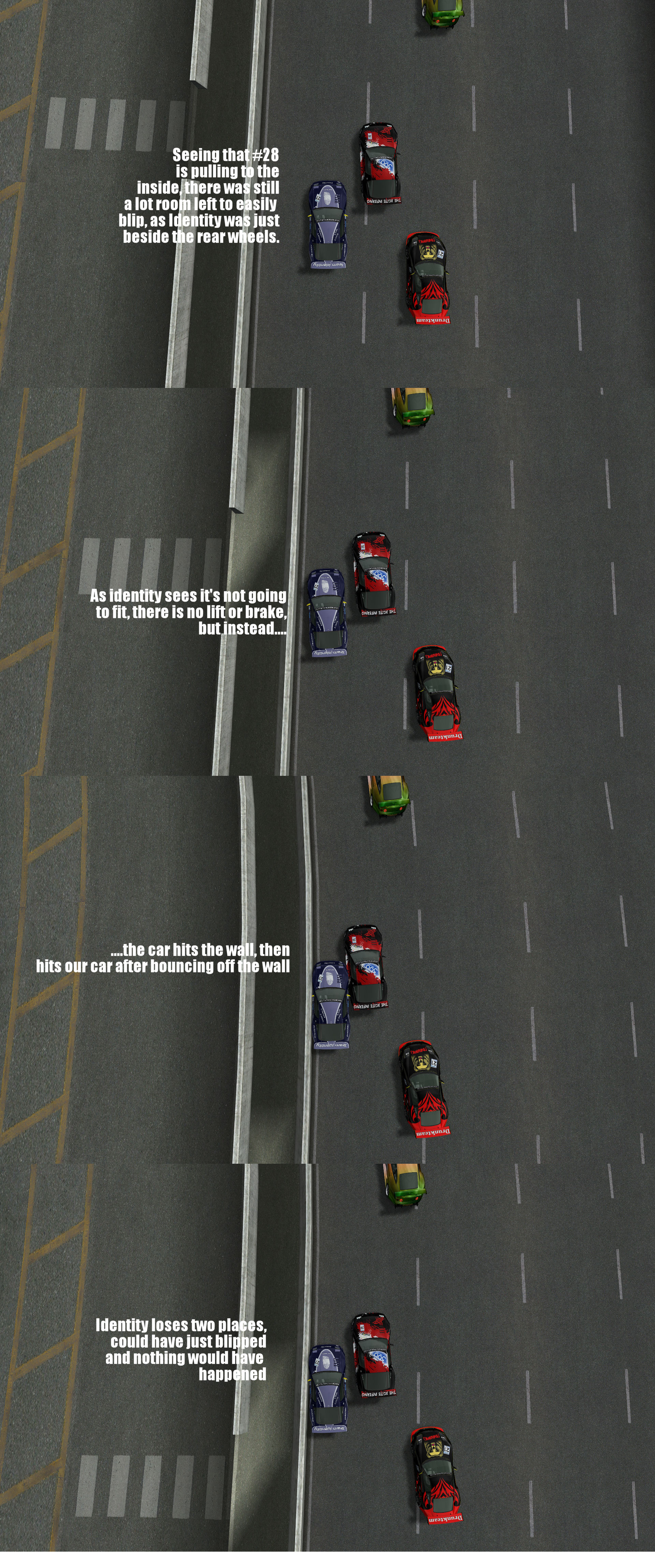 We were 6th when the accident took place. You squeezed us into that wall. Leaving a bit more room would got us through the turn without any problem. We were on the inside. He drove like there was no one there. There wasnt any need to lift, until you squeezed us. We went on the inside, as there was clearly room for it. Then you decided to drive like there was no one there, which ended up in contact.