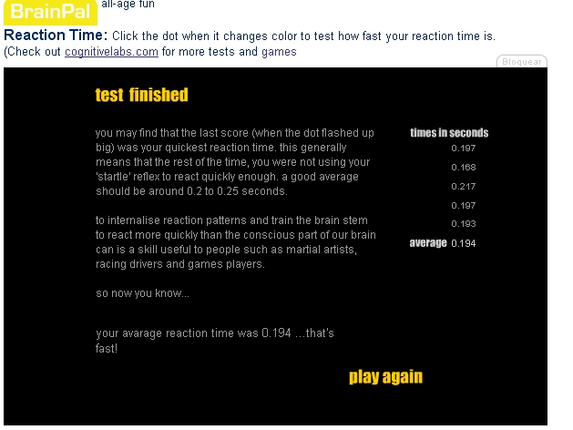 0.196 average. I did have about two beers so who knows what sort of influence that has. I prefer reaction games where you have to physically react though. I guess they're called reflex games instead of reaction games. In the end, a fast twitch is not half as important as a slightly less fast reflex. A goalkeeper that twitches his hands in the wrong direction 0.15s after he sees the ball being shot isn't as useful as the goalkeeper that takes 0.25s to move his hands in the perfect position