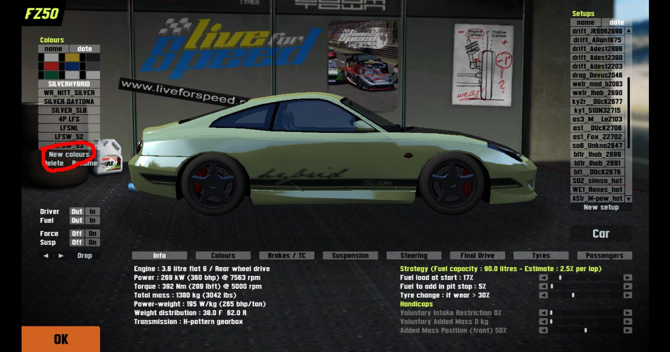 Now start up LFS. Go to the pits screen and select the XRR (XR GTR). Click on the "New colours" button as I've pointed out in an earlier post. You'll get a list of all the skins that are available for the XRR. Select the files that says DRFTFLKN.