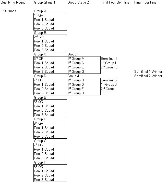 In the group stage every squad drives against all other squads. The groups shall be in size of four to six squads, which makes at least three, at most five matches.