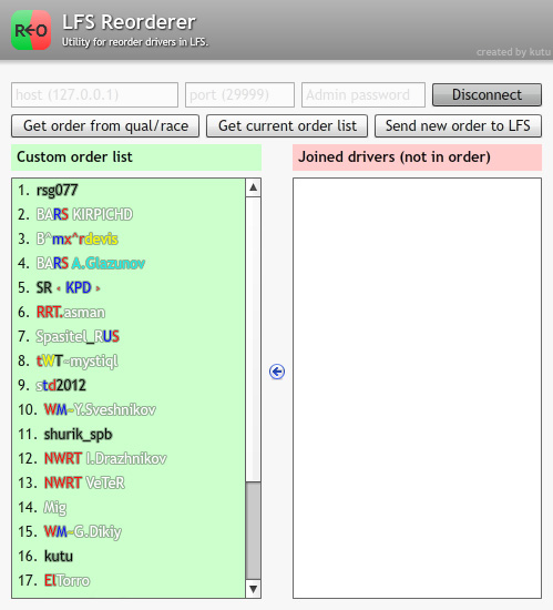LFS Reorderer - utility for Live For Speed, which provided a drag'n'drop interface to reorder drivers before the race start.