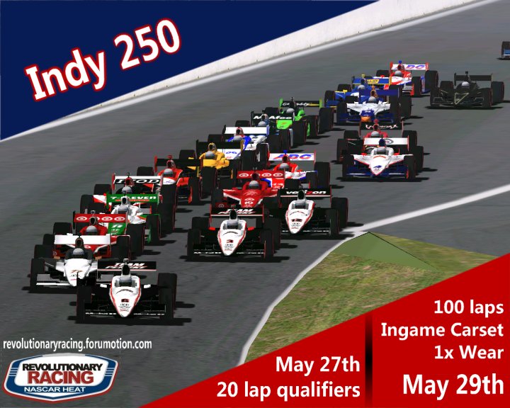 The race will take place on the NASCAR Heat game, in Hardcore mode. Speeds reach an excess of 215 miles per hour in draft. more info @ http://revolutionaryracing.forumotion.com Attached images