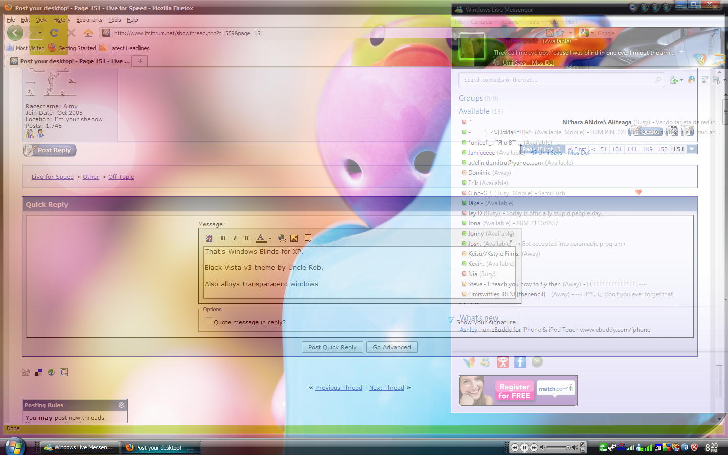Quote from S14 DRIFT :That's Windows Blinds for XP. Black Vista v3 theme by Uncle Rob. Also allows for Window Roll up, transpararent windows, etc. No noticeable affect in performance. sweet thanks.