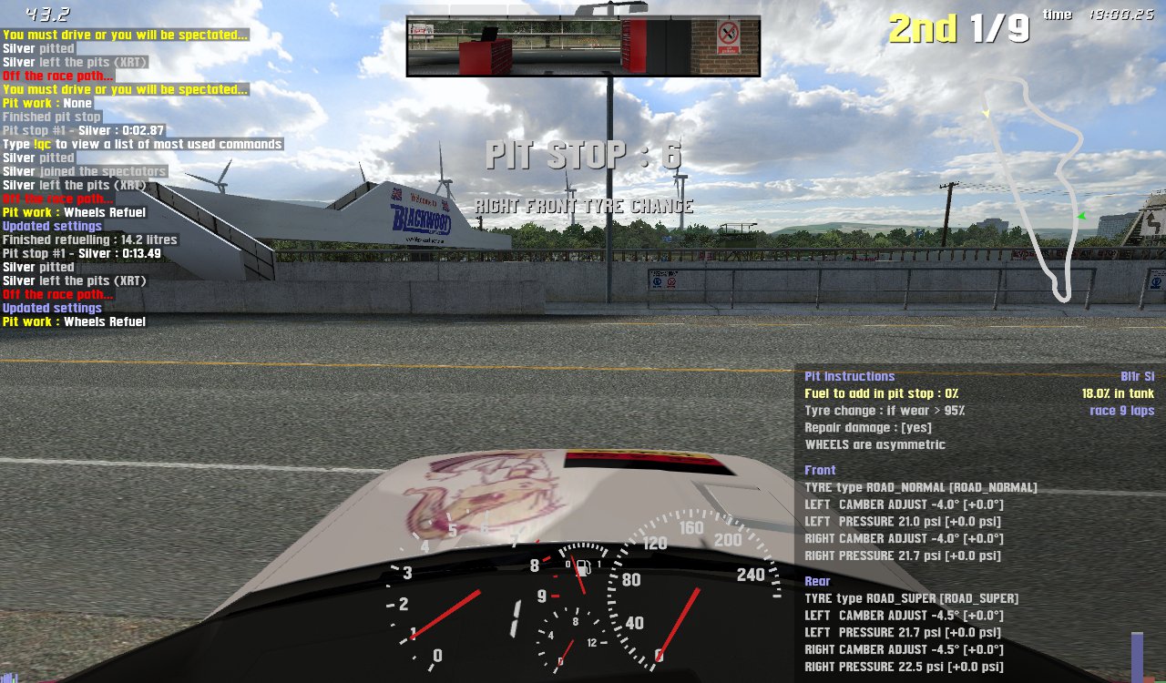 I'd just come from KY GP Long REV, and drove a few laps on FE Green after changing my setup. I went to the pits after a spin and while my car was being repaired, I realized I'd not changed the fuel amounts. So I hit F12 and increased the fuel to be put in, while the tank was already being filled. I increased it to 40%. This resulted in getting "stuck" in the pit box while being told my car was still being refuelled. After a long while of wondering whether it would let me go at some point, I had to ask a fellow racer to push me off the pit box so I could resume racing