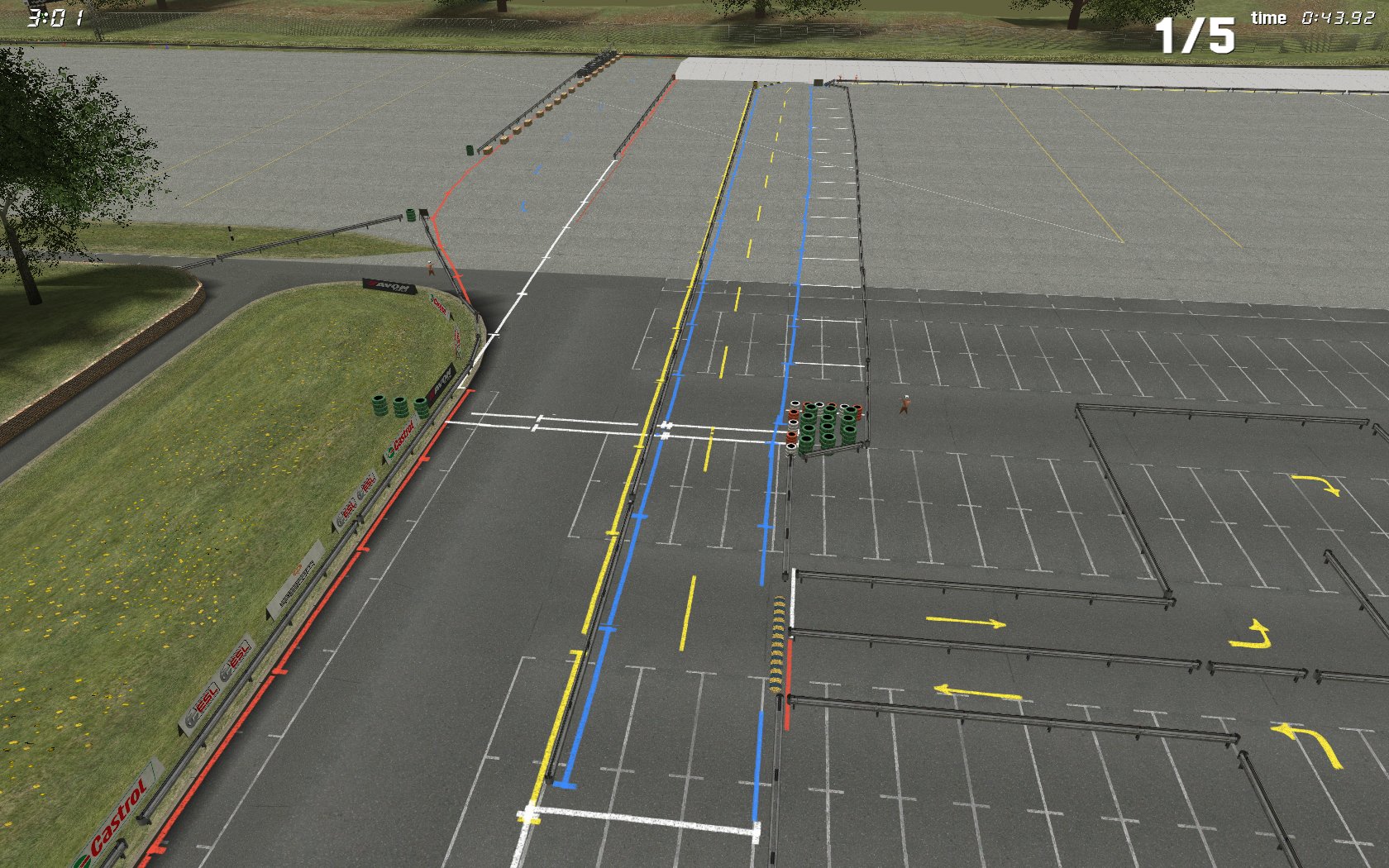 • Pitlane has dotted lines, cars should use the right most before and after entering pit stalls. And the left most if entering stall or if next to another car.