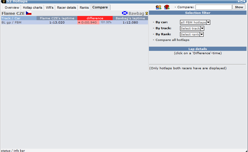 The Hotlap-Compare Function dont Work when you Choose BF1 and FBM,it Shows all 940 Combination´s not only the BF1 or FBM Combinations.