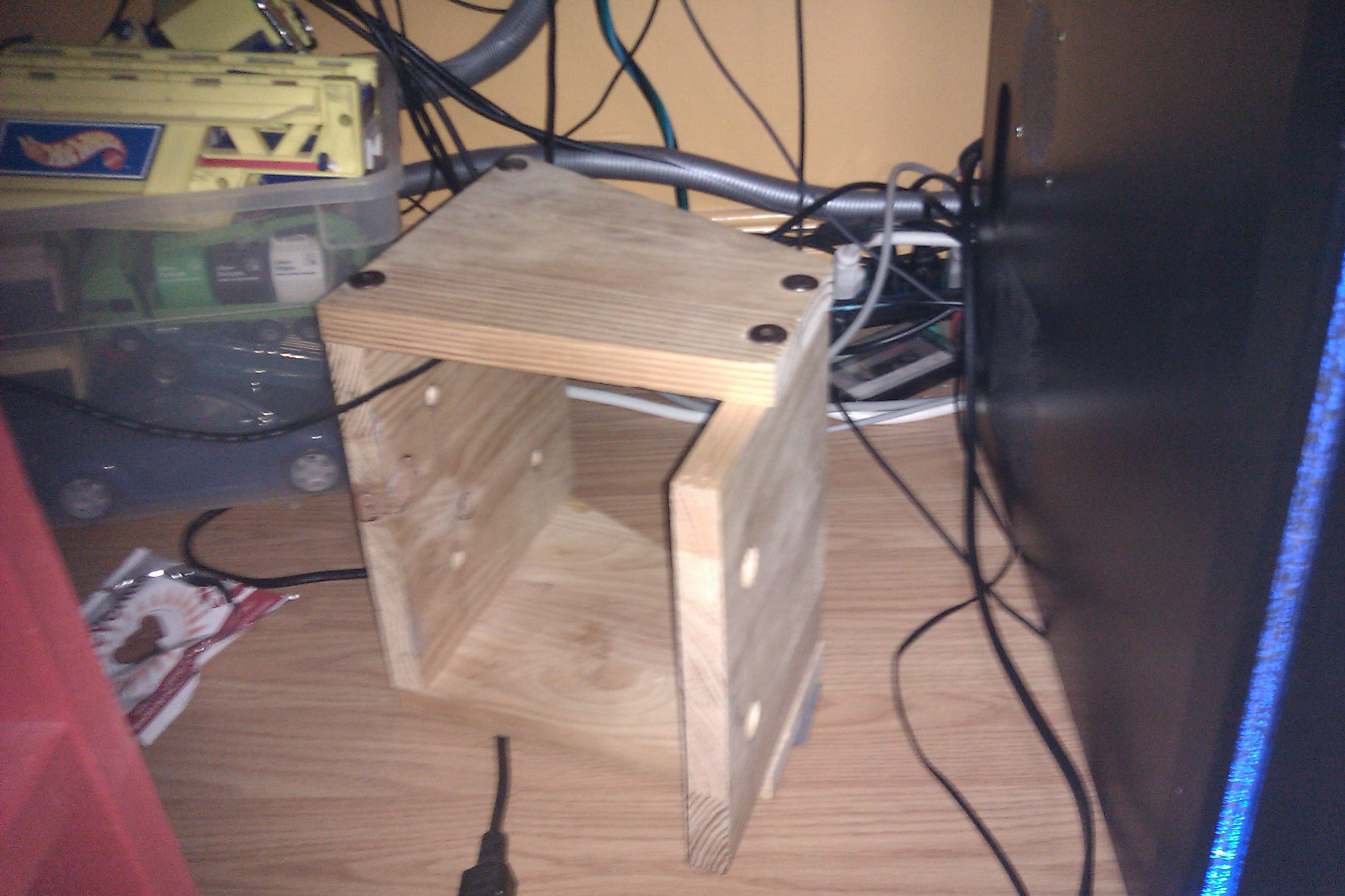I screwed a custom-built wooden platform into my desk, since my desk is hollow, it fell out recently (damn IKEA desk...), due to lack of support. My first idea was to clamp it, but then my father had the idea to screw it in. But now, I have it next to my wheel, until I come up with another way. (something is being thought of right now actually, Imma sketch it out..)