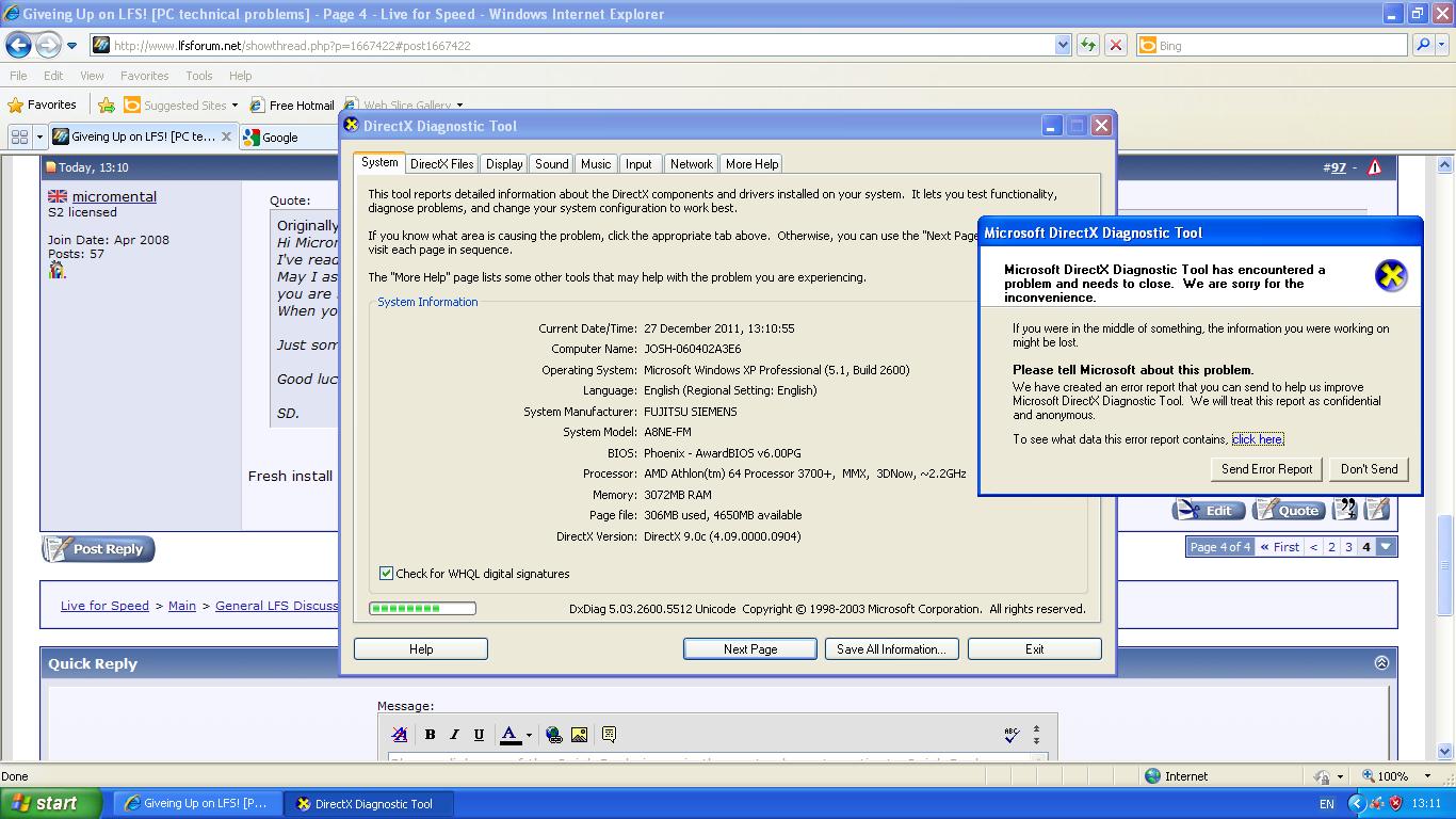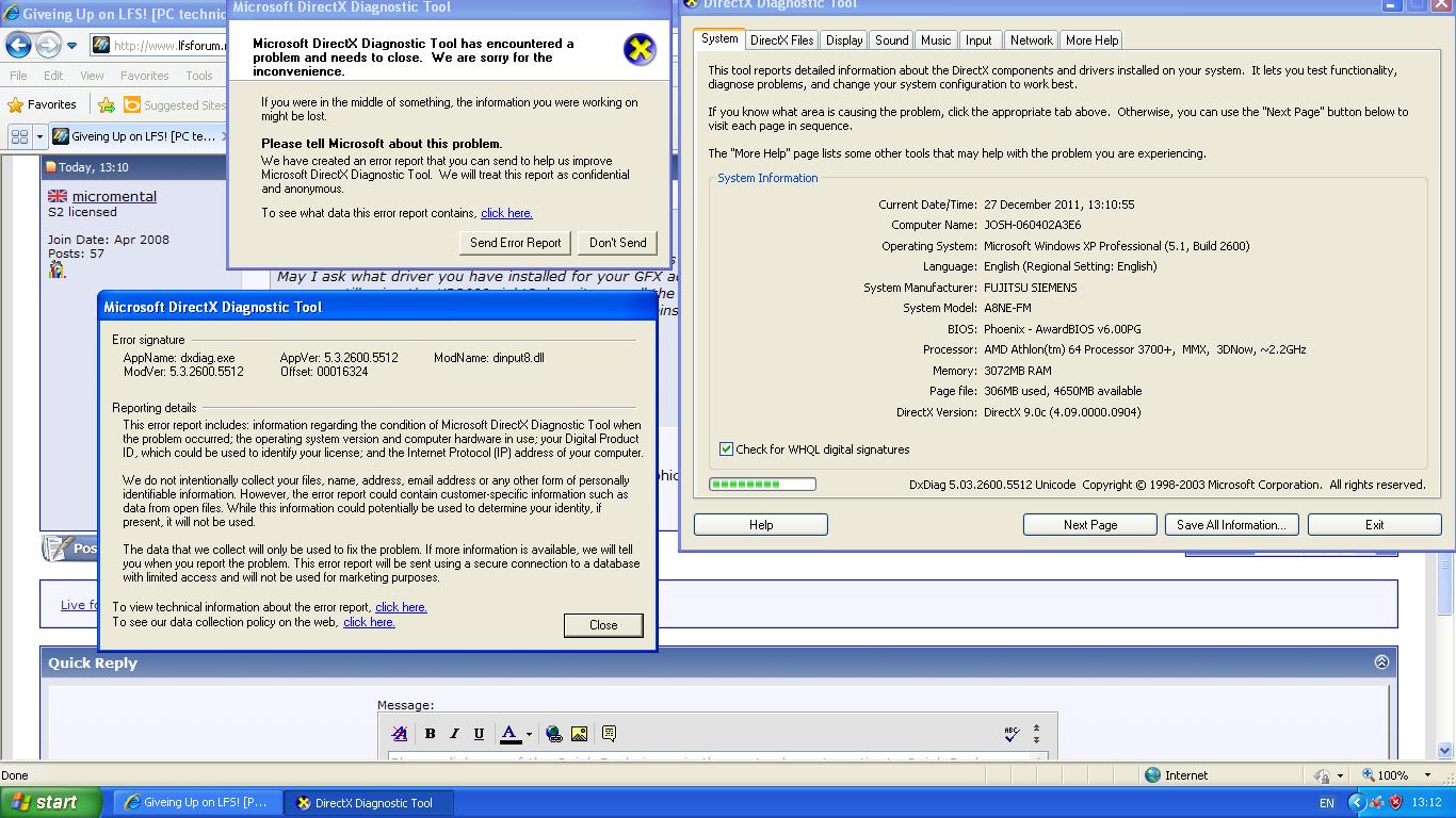 Im the main administrator on my pc iv got a strong feeling its my graphics cards im using an "ATI Radeon x800 GTO EXPRESS" at this momment in time and iv tried it with my "Radeon HD2600XT 2x DUAL LINK DVI 512MB GDDR3 (128-BIT)" and still dosnt work But on my ASUS Graphics card it works but there in my Other computers that my mum and dad use But my mum Has got a new Graphics card and mother board So i can Use the ASUS ut of mums tomoro.