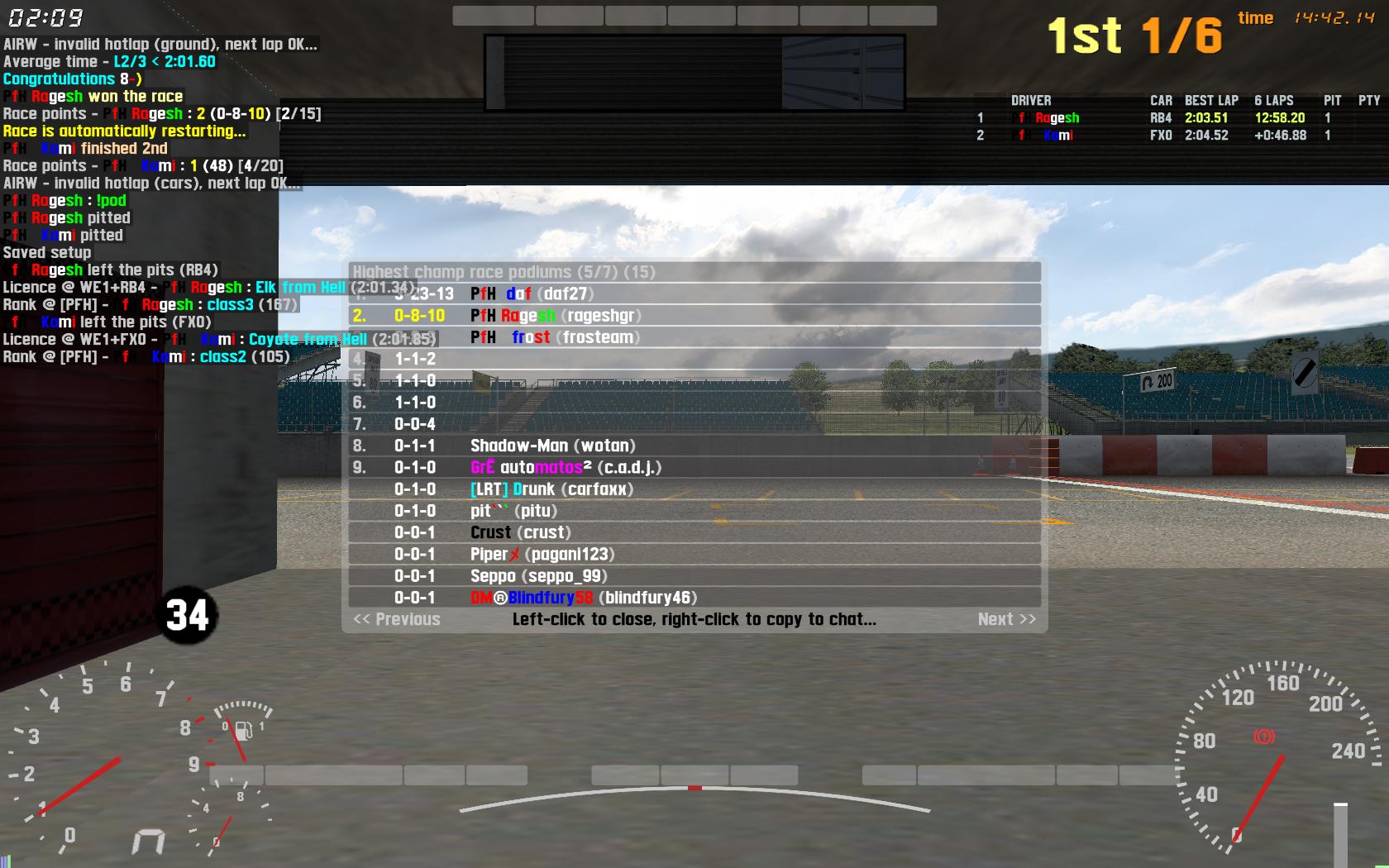 But there is still this problem. For some users, when he wins the race, his second place gets updated. Sometimes the 3rd place gets updated. Please find attached a screenshot. In this screenshot, Pfh Ragesh won the race but my 3rd place points got updated (0-8-10). You can also see that the 1st position column in my points list is 0, because whenever I win Airio thinks I am 2nd or 3rd. Can you please help us with this. Note: In our configuration we have mandatory pitlane enabled. Any help will be appreciated.