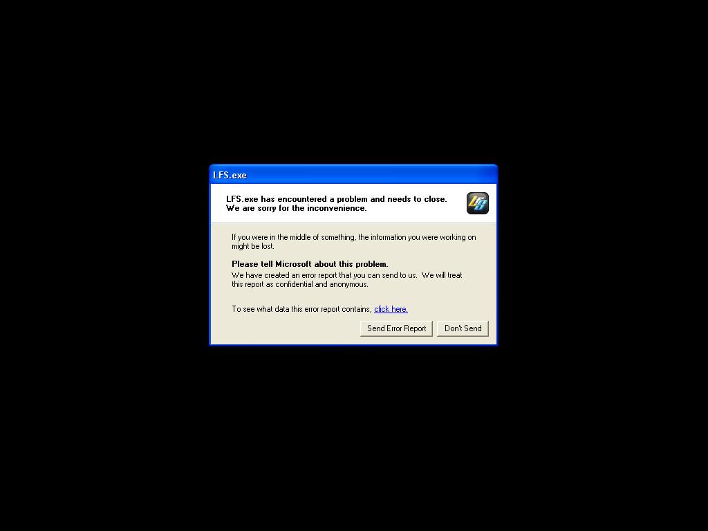 This is what happens, while playing LFS there comes a DONT SEND ERROR REPORT. This was never a problem earlier, but now it is. The game shuts down after pressing don't send. To retify this i have done the following.