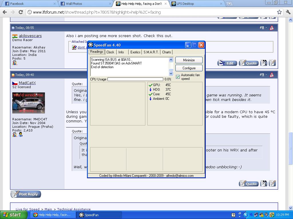 Quote from MadCatX :SpeedFan can log the temperatures, click on the "Charts" tab and tick "GPU" and "Core". Go play LFS and check the temperature graphs. Other causes of random crashes are faulty RAM or MB, but I guess you'd be seeing problems with other applications too if that was the case.