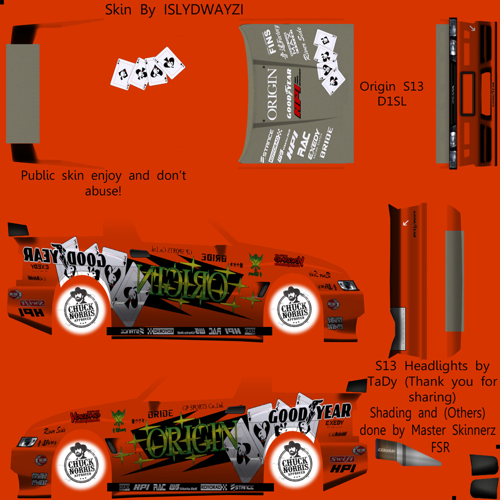 TaDy's S13 headlights with a touch of Master Skinnerz FSR and of course me here you go boys. Origin S13 skin and preview. ENJOY! MORE TO COME! Attached images