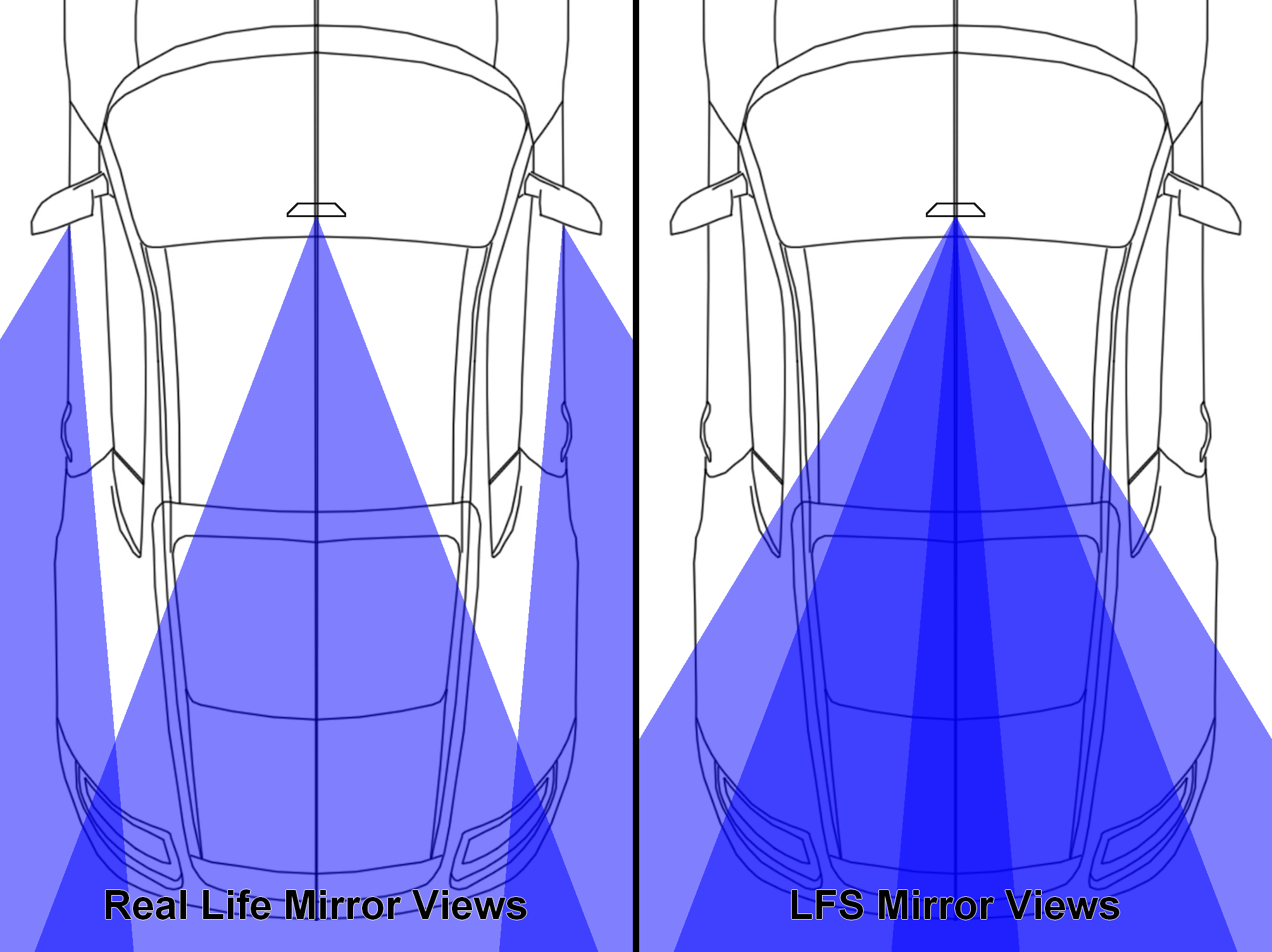 Quote from MadCatX :It's been done like this because of simplicity. LFS would have to set a camera for each mirror and do some non-trivial math to determine what should be drawn in the mirror based on the driver's head position. I remember LockOn having these real rear mirrors and they had quite severe impact on performance.