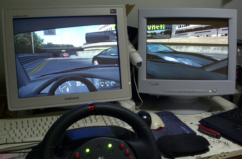 Does anyone know how this was done because i can only get dual view working with the steering wheel split down the middle of the 2 monitors?
