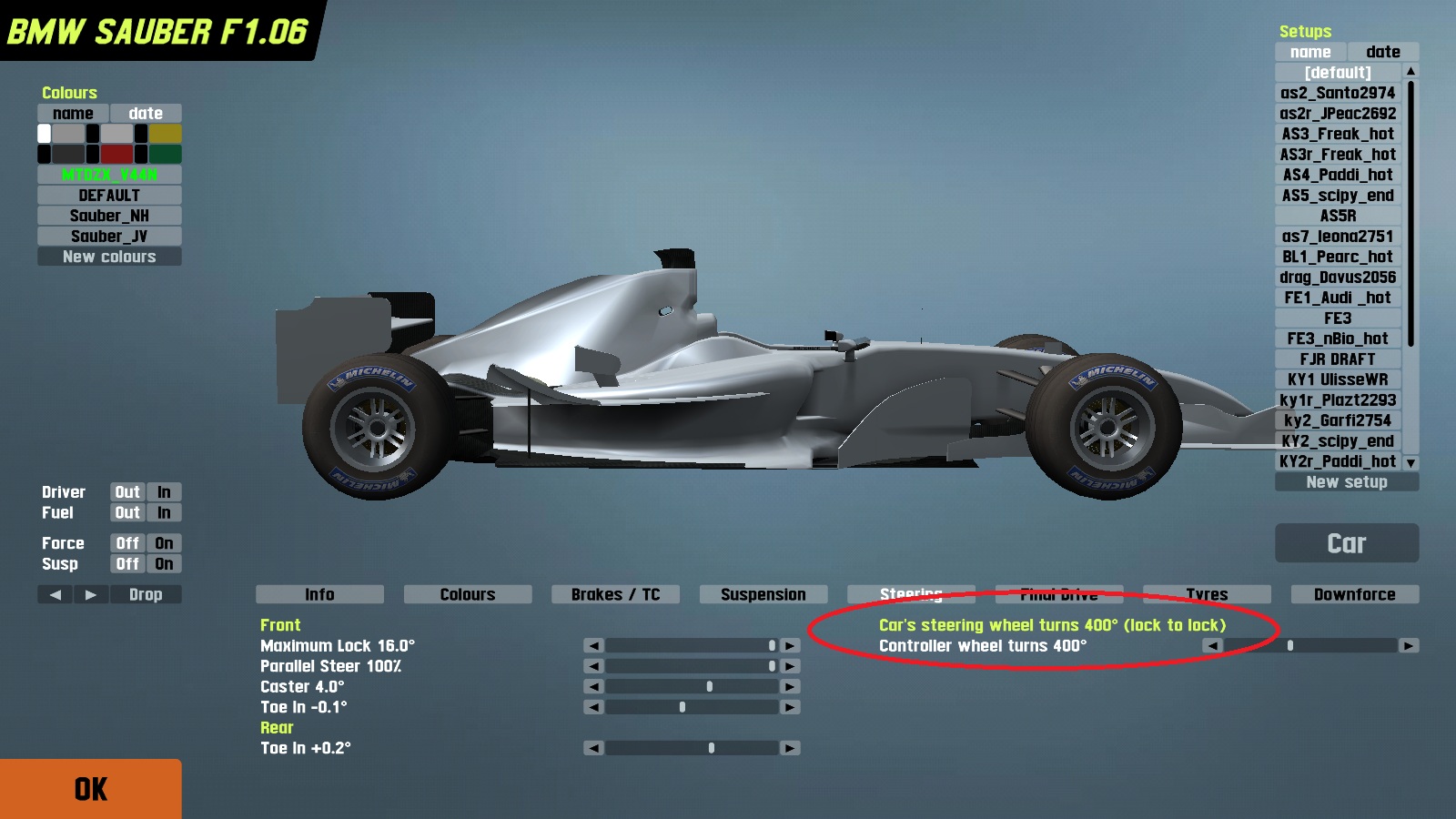Here is an image of all the lock to lock rotation limits for each car so that you know which rotation to use on your actual wheel.