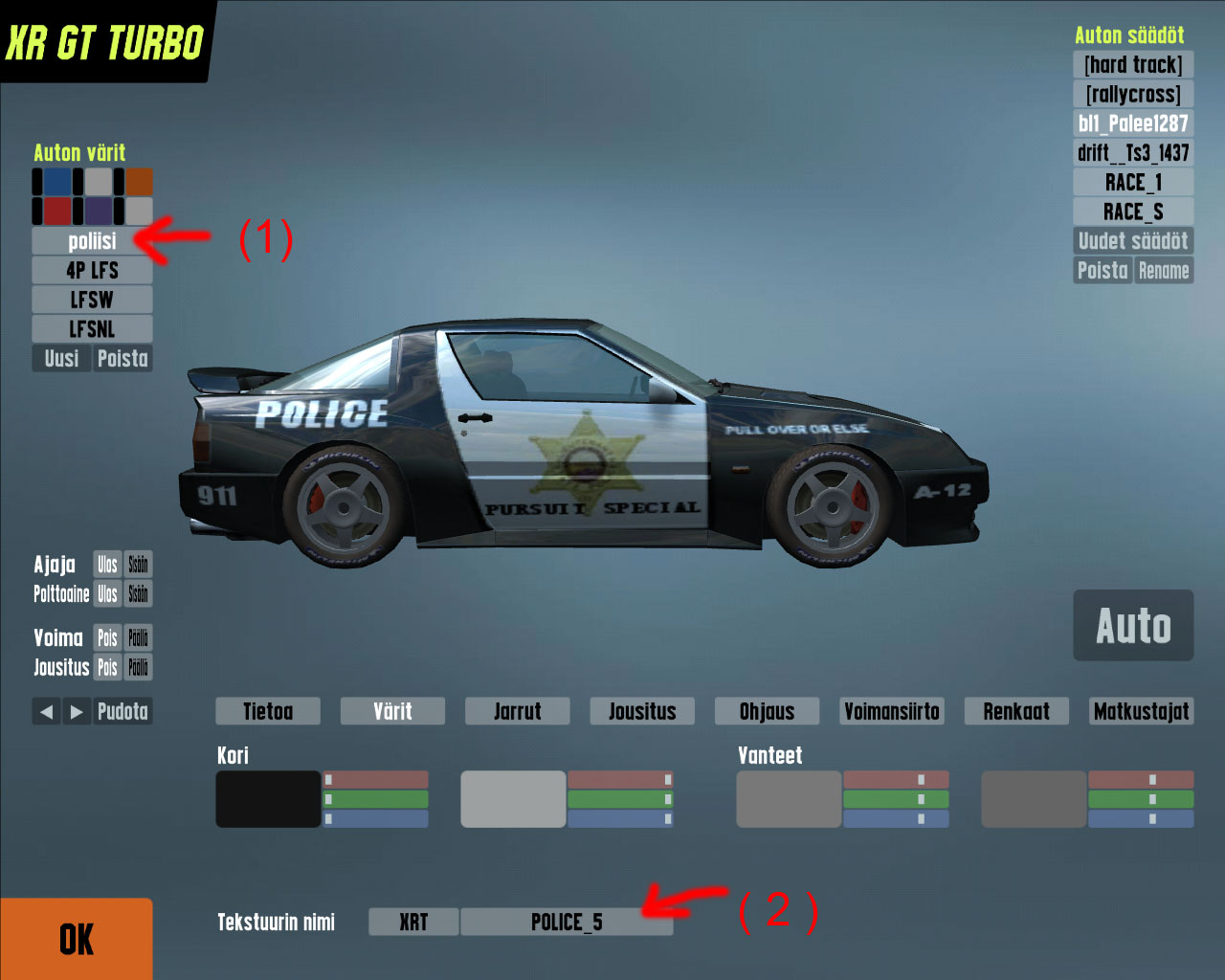 You have to create a new color (1) and load the right skin (2). Also make sure that the skin is in your ..LFS/skins -folder Attached images