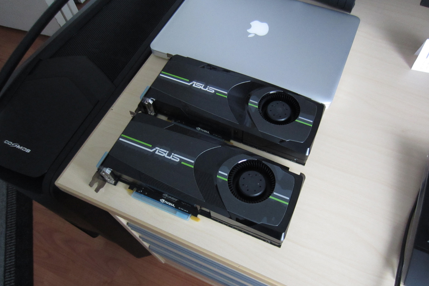 After a month long wait.. graphics cards finally arrived. Although not the EVGA cards I originally ordered (hence the backplates) as they cancelled my order due to shortage of kepler chips from Nvidia.