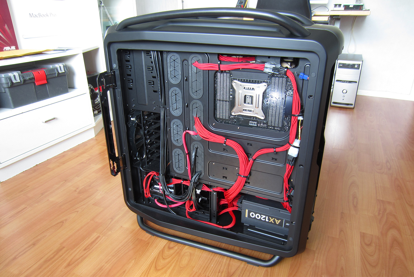 Still rocking 65nm tech here, an old HP microATX case thats been stripped of everything. Cooler Master 460w PSU with hacked up casing, aftermarket fan. Have an overclocked nvidia 240GT (GDDR5 version) with an Arctic Cooling unit. Gigabyte motherboard, 4gigs of DDR3, and a 32gig SSD.