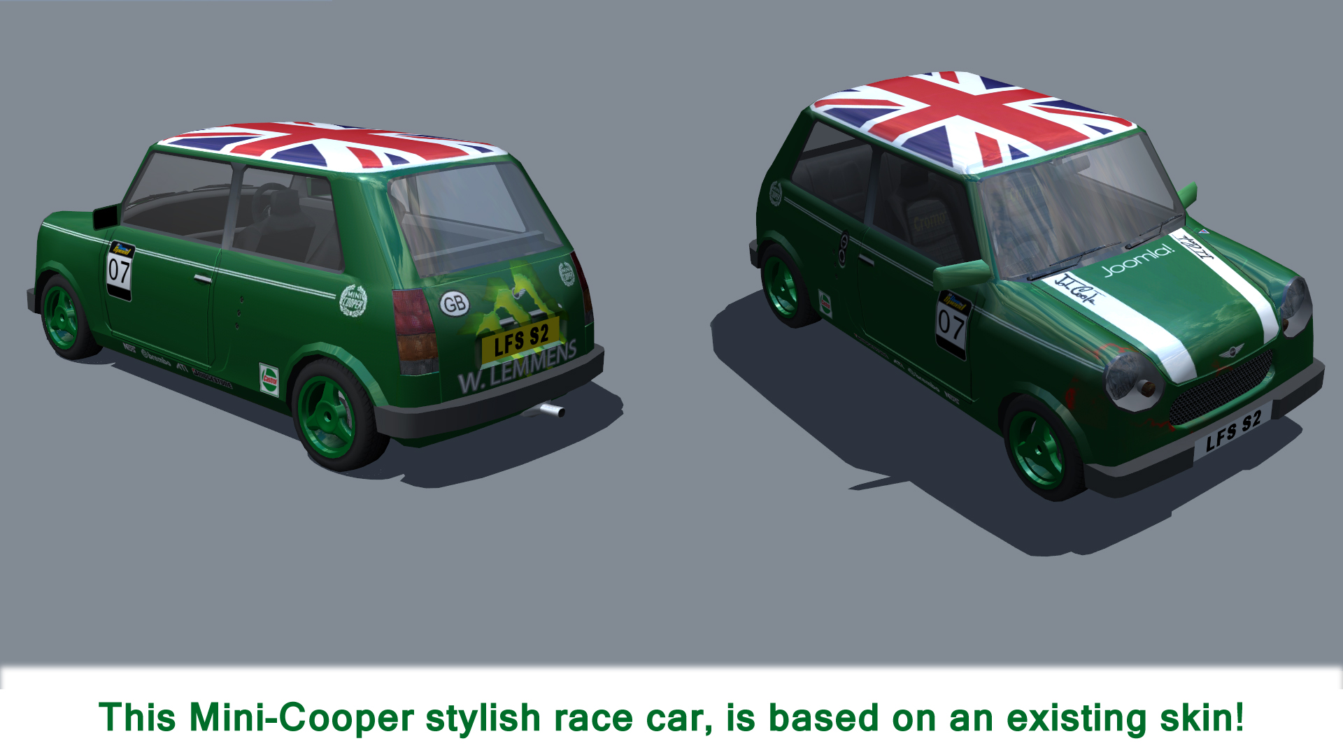 Based on an existing Mini-Cooper stylish skin, I created a nice race skin for myself. Here a preview: