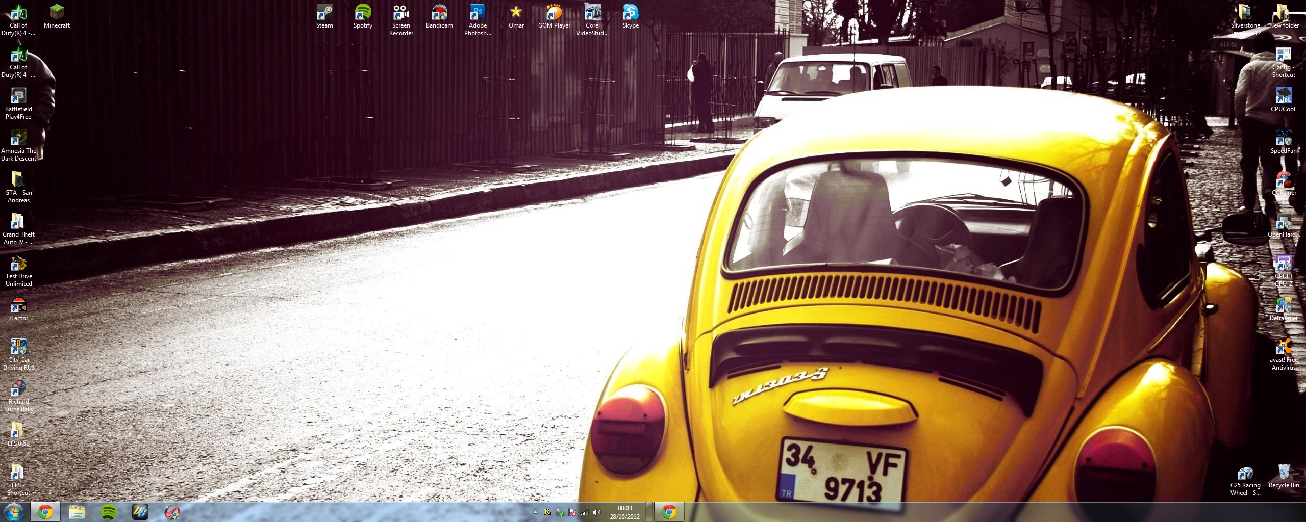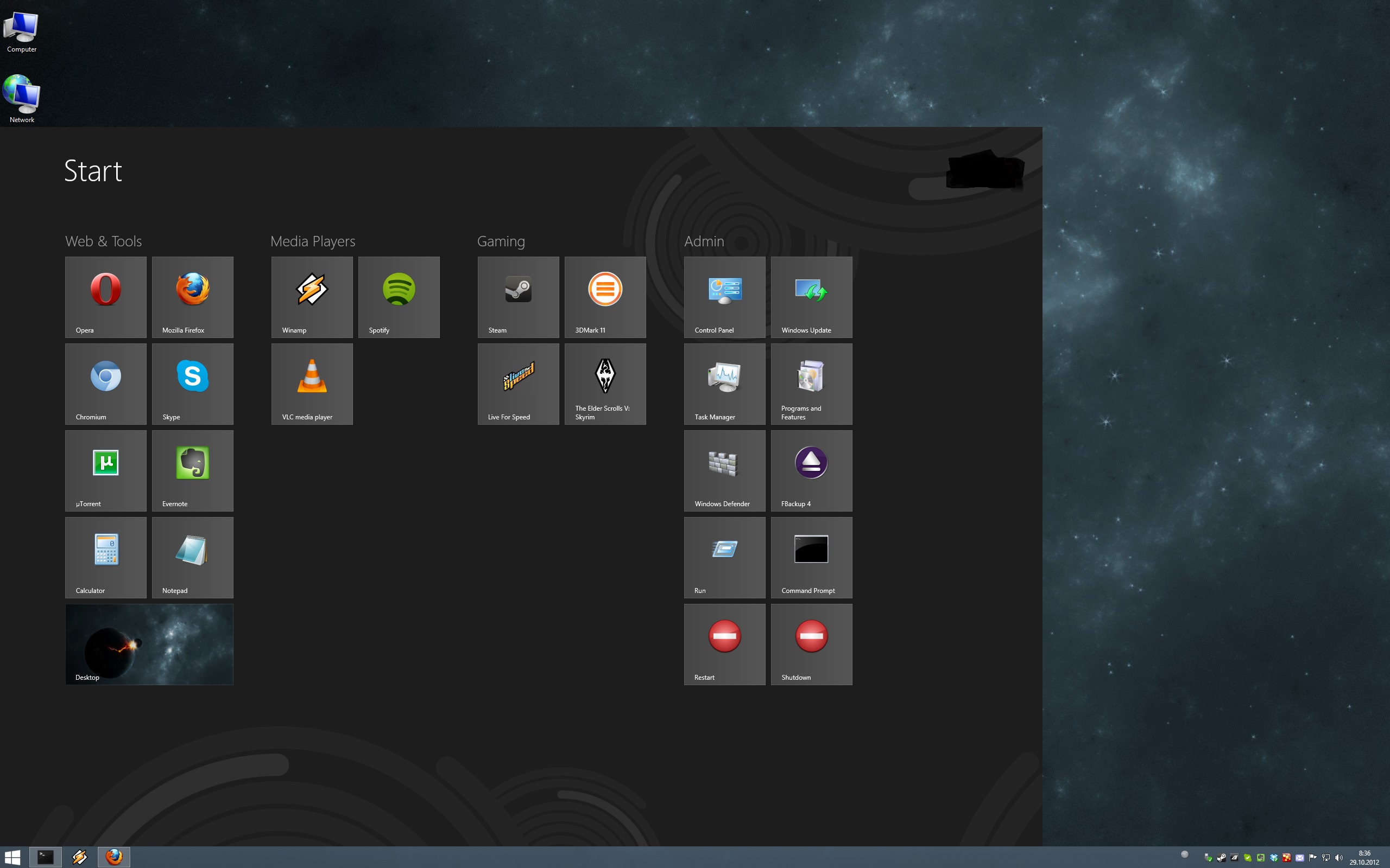 Old and kinda useless dekstop with same color as the Metro one and with no icons. In this way I don't feel the continuous desktop switching, feels the same just with no tiles. And because of the way I organized the rest, I don't need any icon in there.