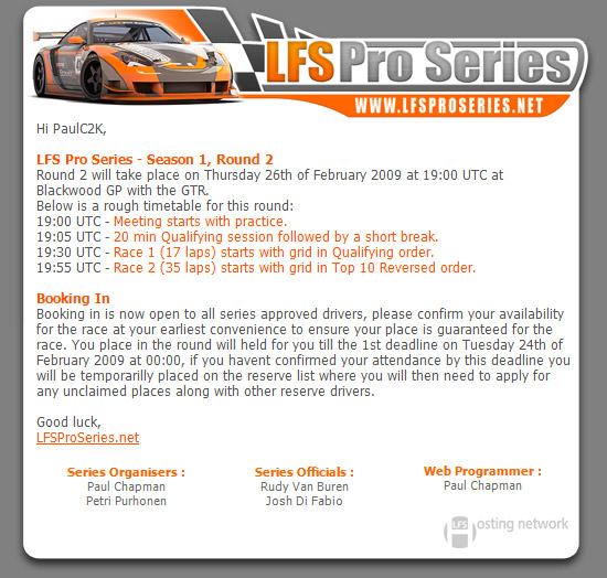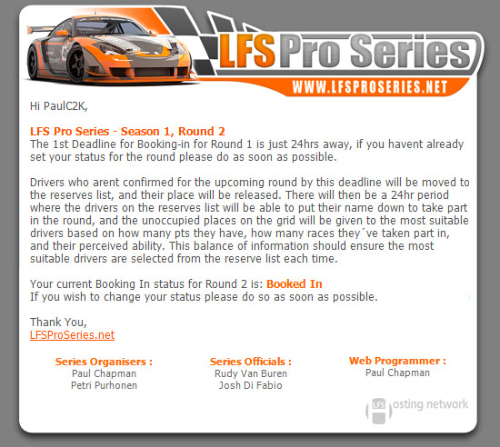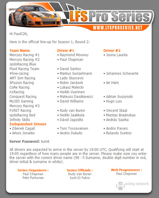 24h before the race, an email containing all the drivers signed up, with their team details, as well as the start time and the server password for that round.