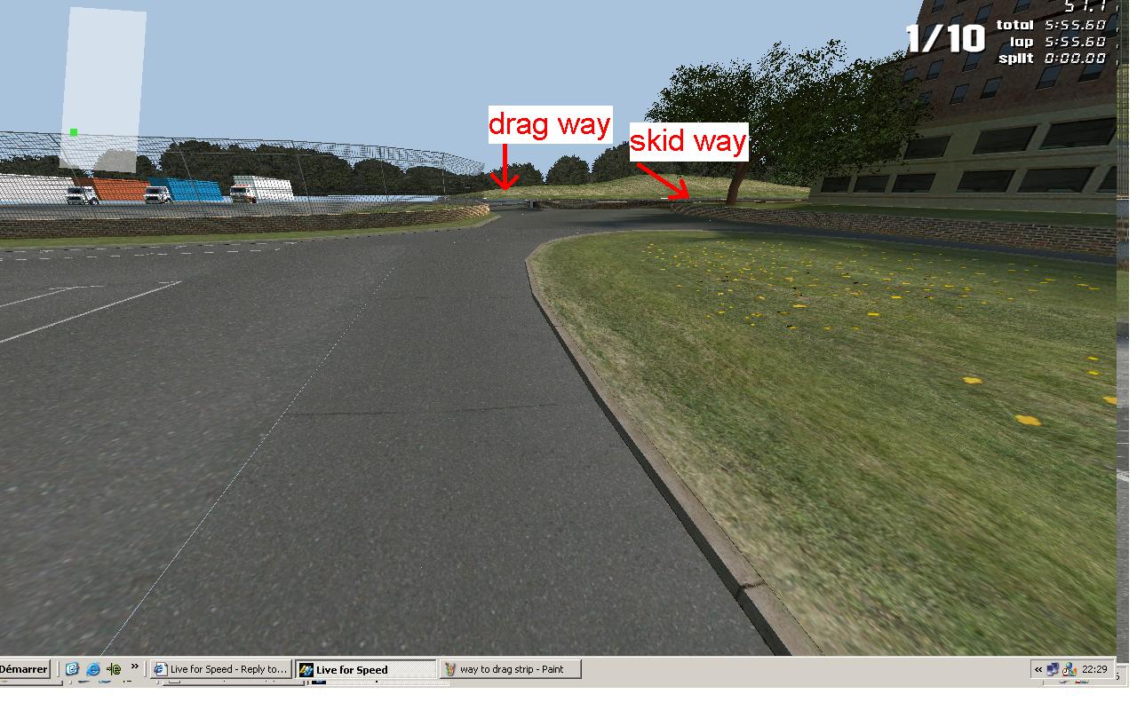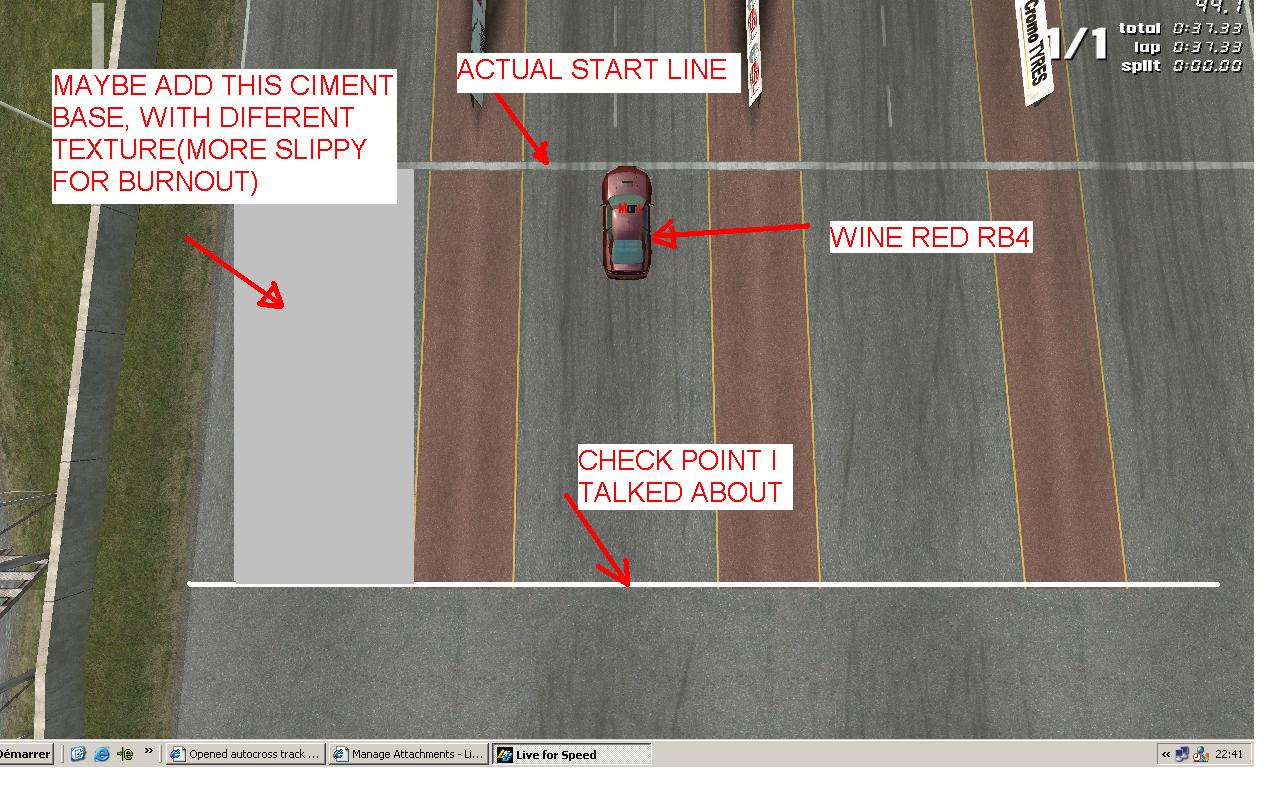 I was indeed just talking about an autocross layout that integrate all, but I also had the idea where u put somekind of a check point\timer on the drag line so when u pass that check point and stop before the start line, a timer start a little count(like 5 seconds and then the lights turns green(need a separate chrono here tho if u want to get your ¼mile time). Anyway the idea is there. Here are the pictures of the way to the drag skip from autocross area.