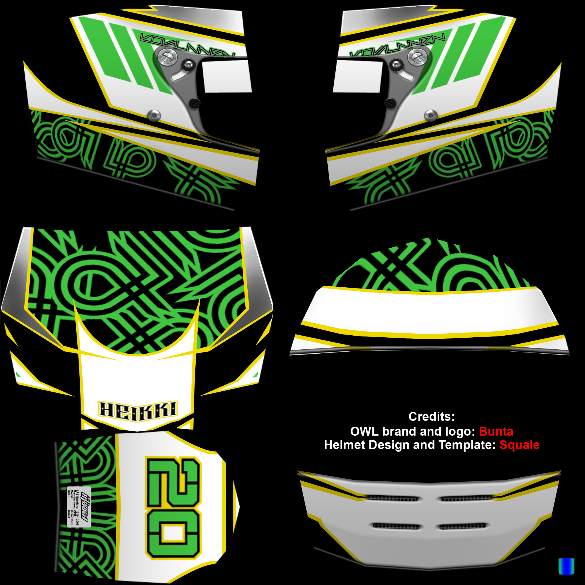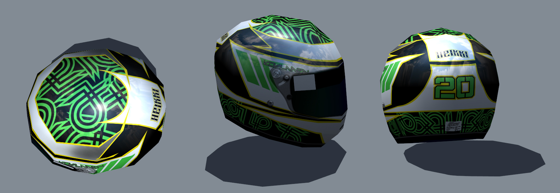 Here is Heikki Kovalainen's helmet in 2013. It's definitely not perfect, but I can't bother to make more Hope you can still like it Attached images