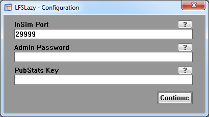 When you first time start LFSLazy, that dialog will open, where you can set all needed data, clicking on each '?' will open up a MessageBox with more info