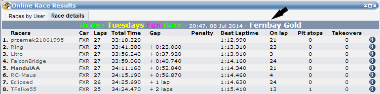 It's not a major thing... today I've found a small track name typo in the detailed Race Results report on LFSW. It's Fernbay, while officially it should be Fern Bay. Check the picture. (As long as I'm not finishing my next race, you can check it out on my profile on LFSW, clicking Last race information and then Details.)