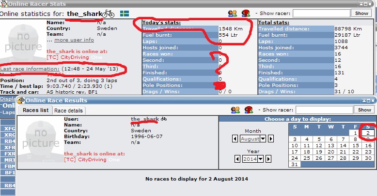 "the shark is online at: TC CityDriving" I don't think in the history of LFS any one ever has completed a race on cruise server which would be needed to update last race info. ed. 1548km for 'Today's stats' is bit iffy.