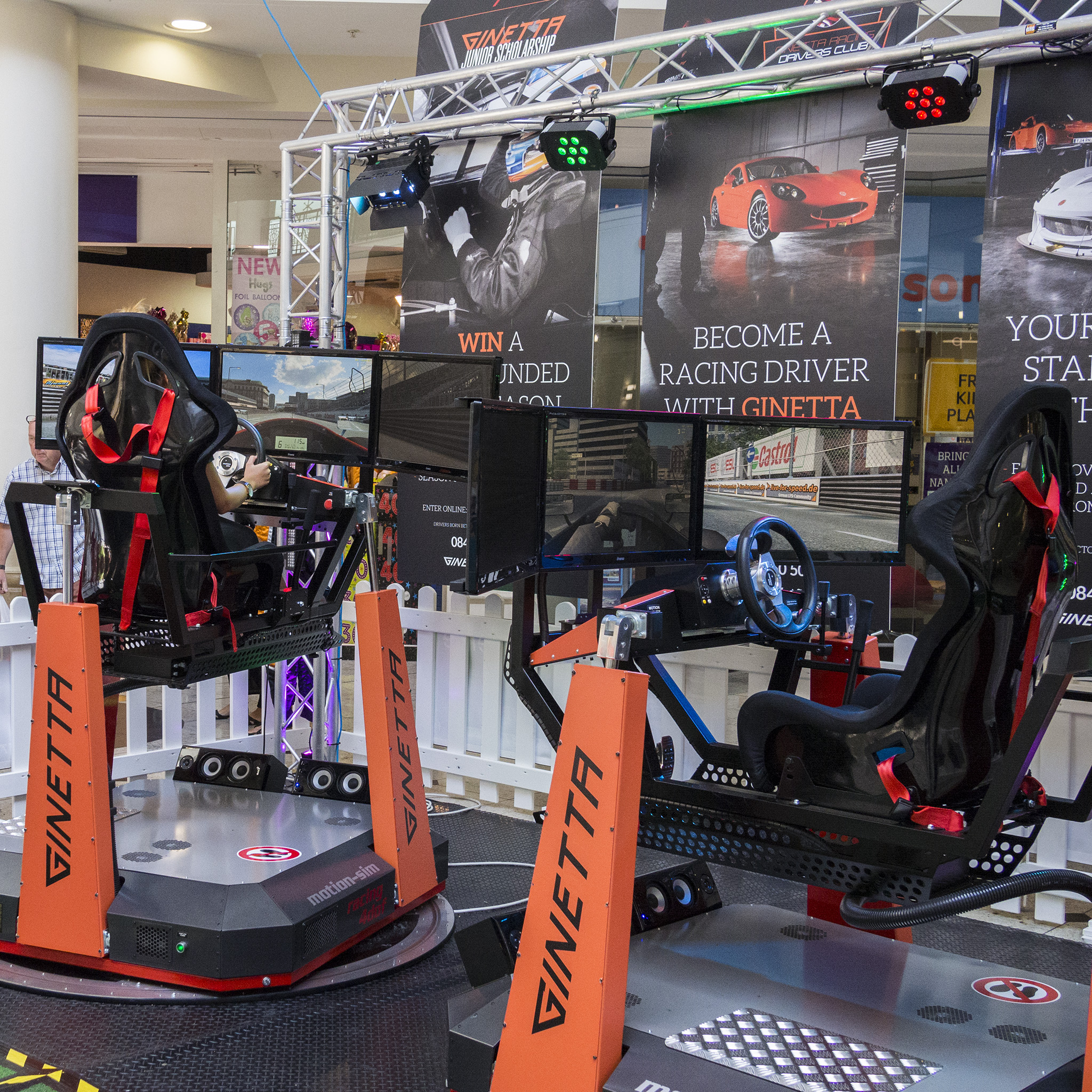 As part of the Ginetta's promotional activities, they have setup two motion simulators, both with triple monitor setups, in Sheffield's large out-of-town shopping center, Meadowhall.