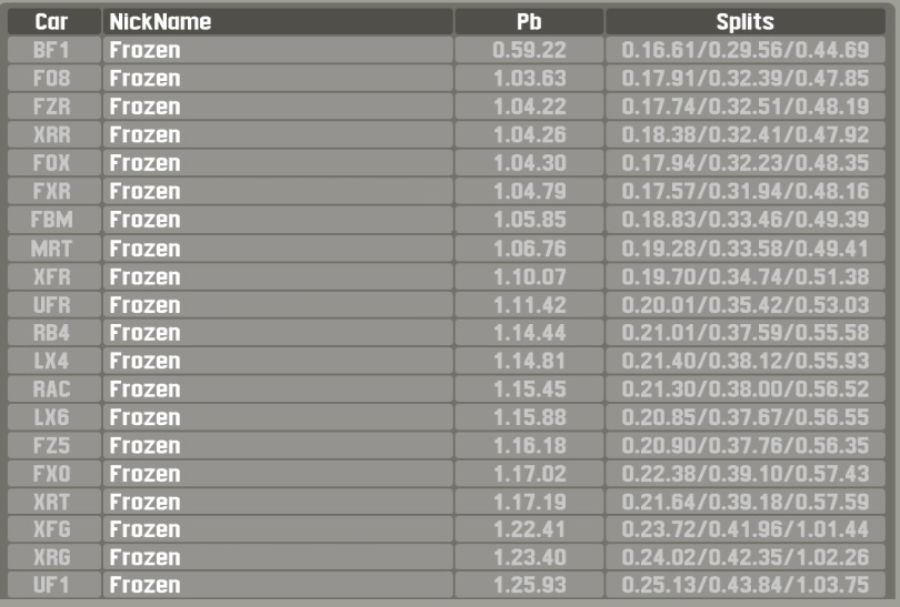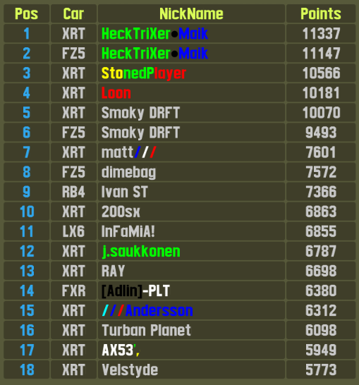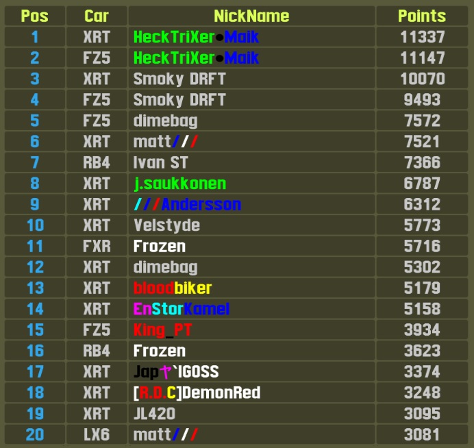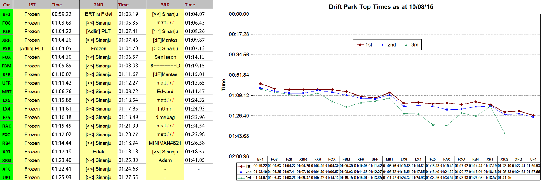 Now over a 100 timed laps been done with this layout on my server, so couple of tables to show best times and drift points achieved as at 23/01/15, all done on single lap from standing start.