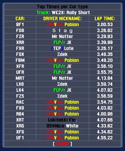 Has rally start and finish positions, 2 visible timed checkpoints, and a number of route 'gates'. Route has to be followed, as invisible checkpoints placed.