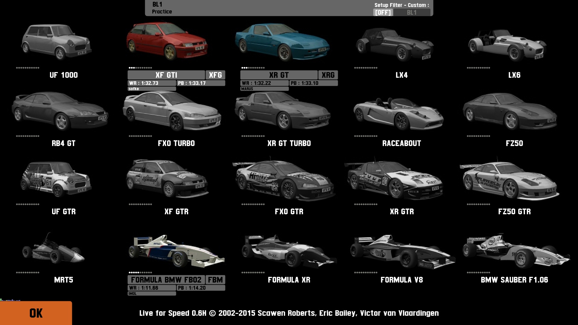 Previously there was only WR and PB shown. I've added username of the WR holder now below WR time as well as little dots above car name. These dots represent current car usage on server, total number of dots is the number of cars in race, and number of white dots is number of specific car in race (e.g. XFG). Also LFSLazy will not draw WR/PB for cars that are disabled on server (according to LFSW). Preview below.