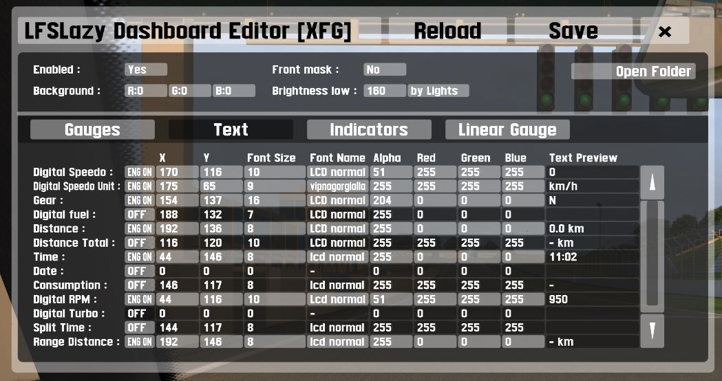Editor is not something that many people use, but still its important to offer great experience for the ones using it. There is now "Open Folder" button that directly opens folder with textures for this car. All the gauges/texts/... buttons are much cleaner now. On top of each column there is name and settings for stuff that is turned off is disabled (dark). You can see how does it look on a picture below.