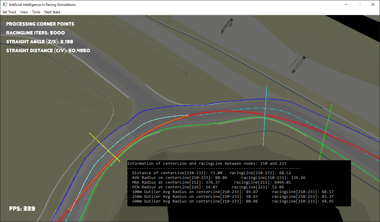 Given only the left and right edges of the track I computed a, reasonable, racing line to follow. I figured out how to mange a virtual controller and even control LFS from another application. Without Live for Speed and the community, my Artificial Intelligence in Racing Simulations would not be where it is today. I'd like to thank Scawen, Victor and Eric.