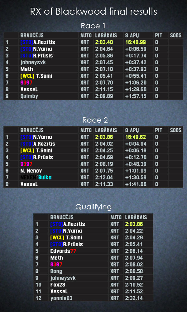 RX of Blackwood provided some great fun. While race 1 was pretty much decided from the start and all the battles were in middlefield, reversed top6 grid positions made race 2 much more intense in top of the field. Despite having started from lower positions STO drivers still menaged to gain 1-2 pretty early.