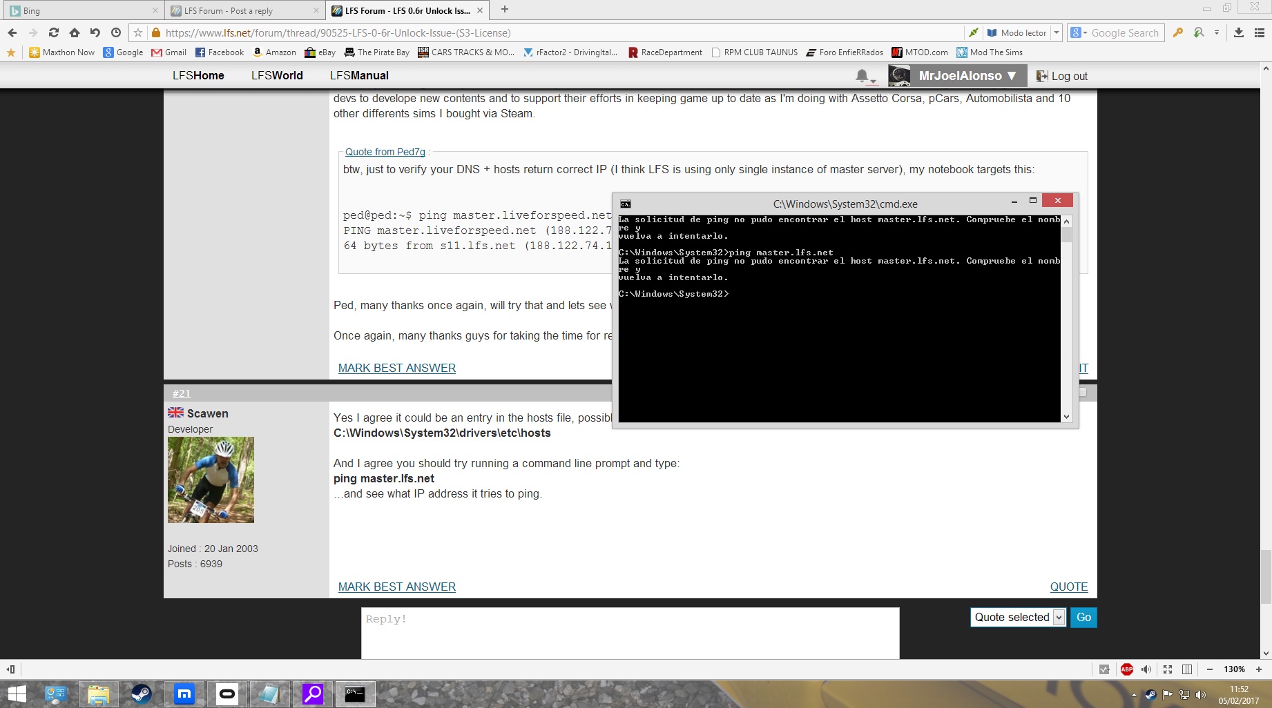 Quote from Ped7g :Just to make sure (if you were using some other ways to play LFS before), you have the official lfs.exe downloaded from lfs.net? Also can't it be you have modified /etc/hosts file (not sure where it is in windows) rerouting the lfs.exe to wrong master server IP?