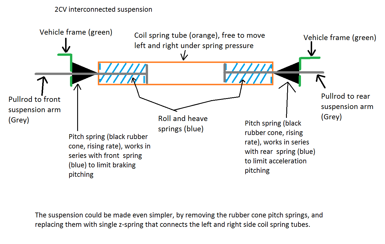 Even the 2CV suspension could be made simpler. Simplest interconnected suspension could be made with 3 z-springs. A z-spring is spring that resists wheel movement in same direction, but wheels are free to move in opposite directions. For example centrally pivoted leaf spring, or torsion bar in z-shape (antirollbars are u-springs, springs that resist movement in opposite direction)
