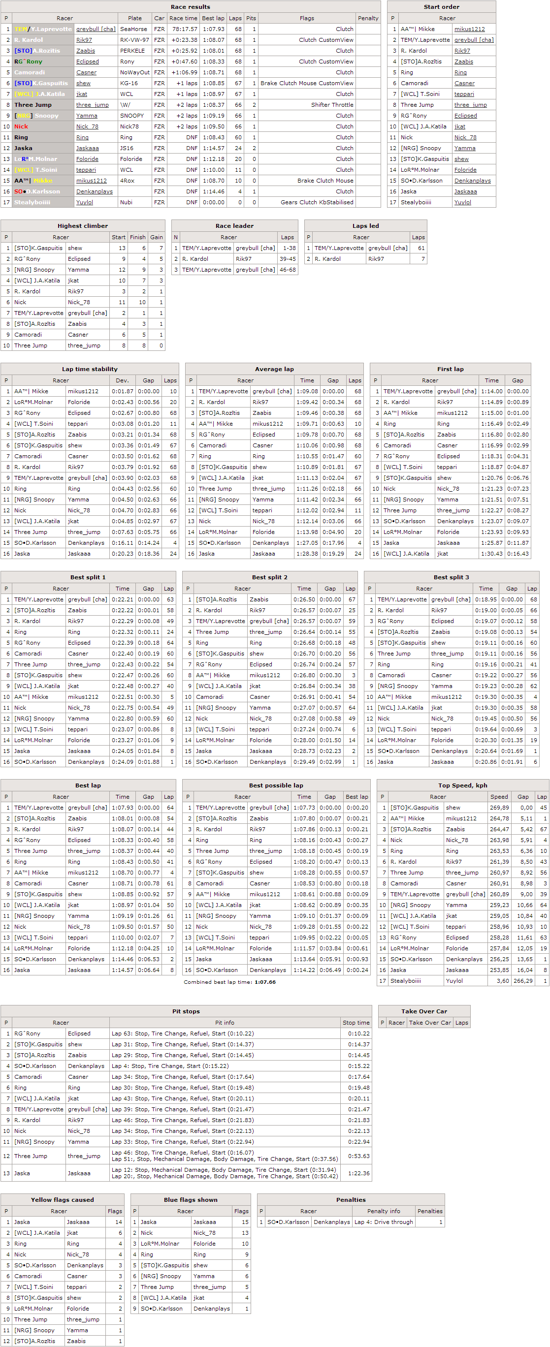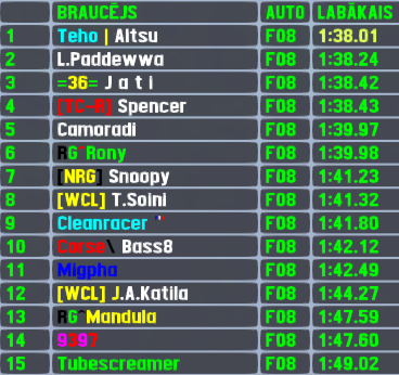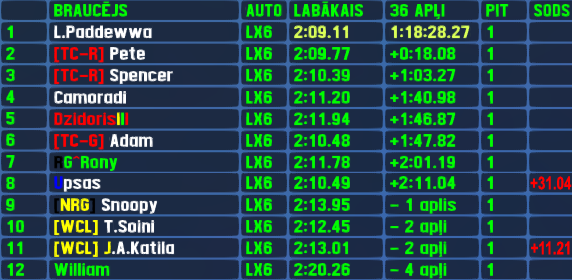 He did pick the combo and he used his choice well - L.Paddewwa set the fastest lap and led the most laps on his way to 2nd win in row,which happened also to have the biggest margin of victory - 19 seconds. Since it was his 2nd race and he repeated the performance,L.Paddewwa has now a 2 in all his stats. The highest in rating from attending racers was Spencer,who improved his best postition in both qualifying and race to 2nd and took his 3rd top5 finish,leveling up with M.Rukmanis at the top of this chart. Camoradi finished 3rd,which is also his best ever finish after improving also his best qualifying result,he finished 6th in his previous attempt. The list of best position improvers does not stop - 4th was Adam,who improved from 8th,but 5th - Sende,who improved from... Well,it was his 1st race actually.