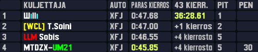 Some more fresh things: Arska ( LFSW: Arsk4 ) was finished 4th. Last time he actually finished a race was Round 37, so it was about time! All four mentioned racers selected XR GT3.