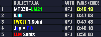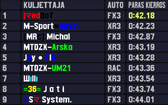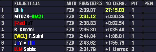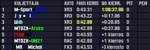 7th place goes to [MRc] Michal ( LFSW: michal 1279 ), who had engine problem, which occurred on somewhere first laps, having only top speed 20km/h less than the others. That explains why 3 laps behind finished.