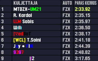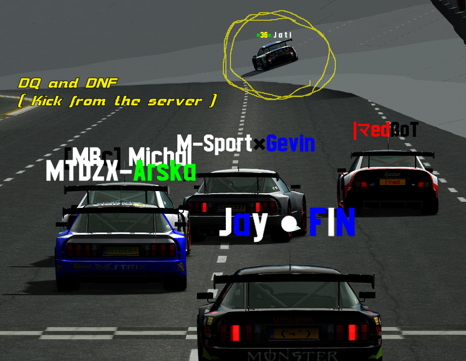 FSR System. ( LFSW: Kova. ) was retired from the race by connection problem and =36= J a t i ( LFSW: Jatimc ) was kicked from the server by his actions.